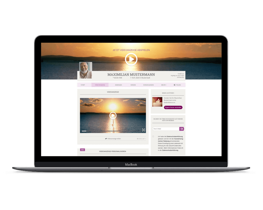 Gehen Sie auf die Anzeigen-Suche auf der Startseite und finden Sie die entsprechende Gedenkseite. Neben den Anzeigen, Kondolenzen und Kerzen finden Sie hier nun auch die neue Trauer-Videoanzeige. Sie können diese direkt im Header oder dem entsprechenden Inhaltsblock abspielen. Über den Menüpunkt „VIDEOANZEIGE“ gelangen Sie auf die Unterseite, auf der Sie das Video anpassen können.
