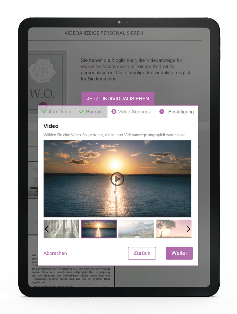 Ab sofort wird es zu jeder Traueranzeige ein wundervolles Video geben. Die Trauer-Videoanzeige wird automatisch generiert, kann aber von Ihnen individuell angepasst werden. Laden Sie beispielsweise ein eigenes neues Profilfoto hoch und suchen Sie sich eine der acht verschiedenen Videovorlagen aus.