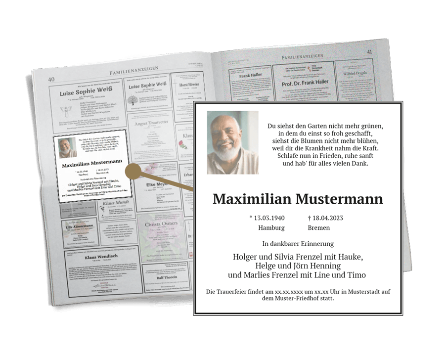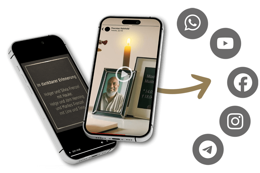 Nicht alle Angehörigen erhalten die Tageszeitung, in der die Traueranzeige abgedruckt ist. Mit dieser sehr persönlichen und emotionalen Videoanzeige können Sie Ihre Kontakte via Social Media und Messenger-Dienste über das Ableben eines geliebten Menschen informieren. Das Video wurde speziell für soziale Netzwerke entwickelt. Es kann im WhatsApp-Status, in WhatsApp-Gruppen, Instagram-Stories und vielem mehr geteilt werden.