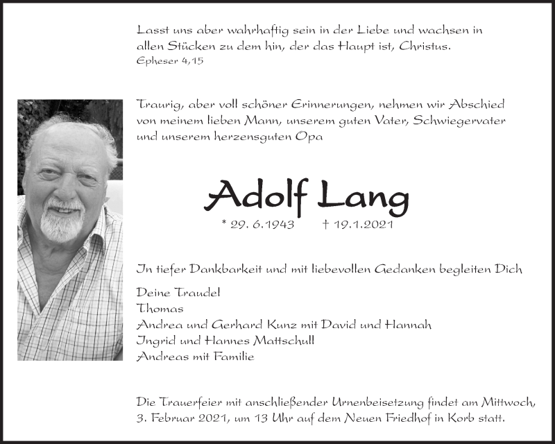 Hier finden Sie alle Traueranzeigen aus der Zeitung, die bisher für Adolf Lang erschienen sind. Weitere Traueranzeigen, die in der Zeitung erscheinen, werden hier ebenfalls aufgelistet