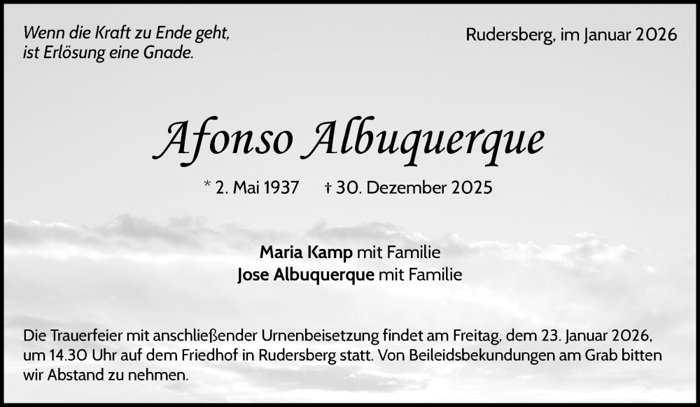 Hier finden Sie alle Traueranzeigen aus der Zeitung, die bisher für Afonso Albuquerque erschienen sind. Weitere Traueranzeigen, die in der Zeitung erscheinen, werden hier ebenfalls aufgelistet