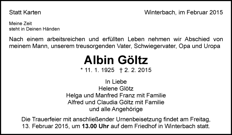 Hier finden Sie alle Traueranzeigen aus der Zeitung, die bisher für Albin Göltz erschienen sind. Weitere Traueranzeigen, die in der Zeitung erscheinen, werden hier ebenfalls aufgelistet