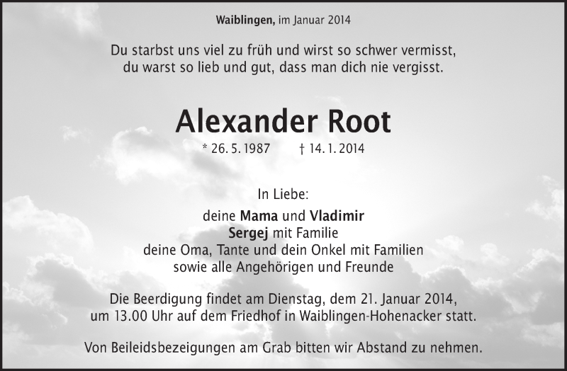 Hier finden Sie alle Traueranzeigen aus der Zeitung, die bisher für Alexander Root erschienen sind. Weitere Traueranzeigen, die in der Zeitung erscheinen, werden hier ebenfalls aufgelistet