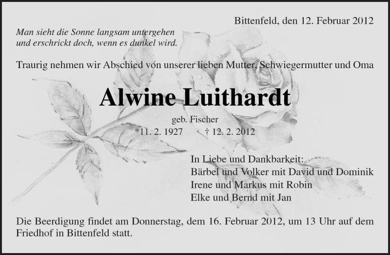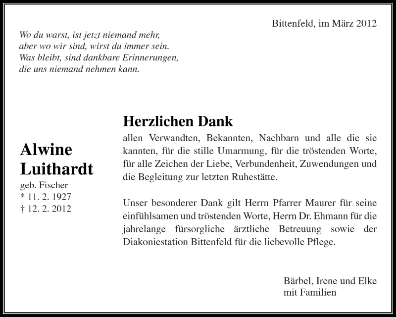 Hier finden Sie alle Traueranzeigen aus der Zeitung, die bisher für Alwine Luithardt erschienen sind. Weitere Traueranzeigen, die in der Zeitung erscheinen, werden hier ebenfalls aufgelistet