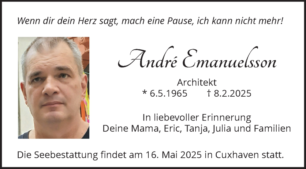 Hier finden Sie alle Traueranzeigen aus der Zeitung, die bisher für André Emanuelsson erschienen sind. Weitere Traueranzeigen, die in der Zeitung erscheinen, werden hier ebenfalls aufgelistet