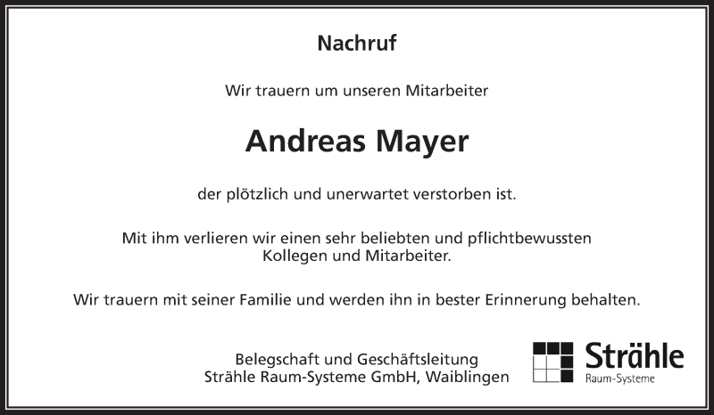 Hier finden Sie alle Traueranzeigen aus der Zeitung, die bisher für Andreas Mayer erschienen sind. Weitere Traueranzeigen, die in der Zeitung erscheinen, werden hier ebenfalls aufgelistet