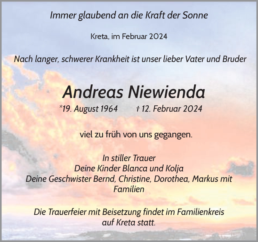 Hier finden Sie alle Traueranzeigen aus der Zeitung, die bisher für Andreas Niewienda erschienen sind. Weitere Traueranzeigen, die in der Zeitung erscheinen, werden hier ebenfalls aufgelistet