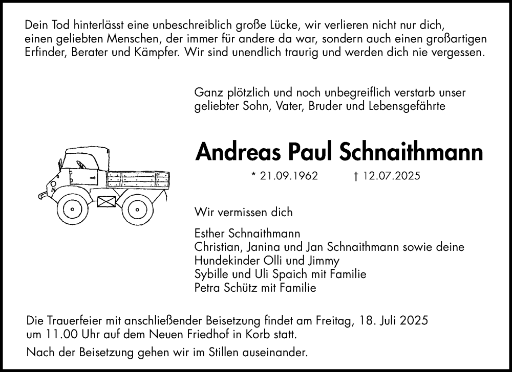 Hier finden Sie alle Traueranzeigen aus der Zeitung, die bisher für Andreas Paul Schnaithmann erschienen sind. Weitere Traueranzeigen, die in der Zeitung erscheinen, werden hier ebenfalls aufgelistet