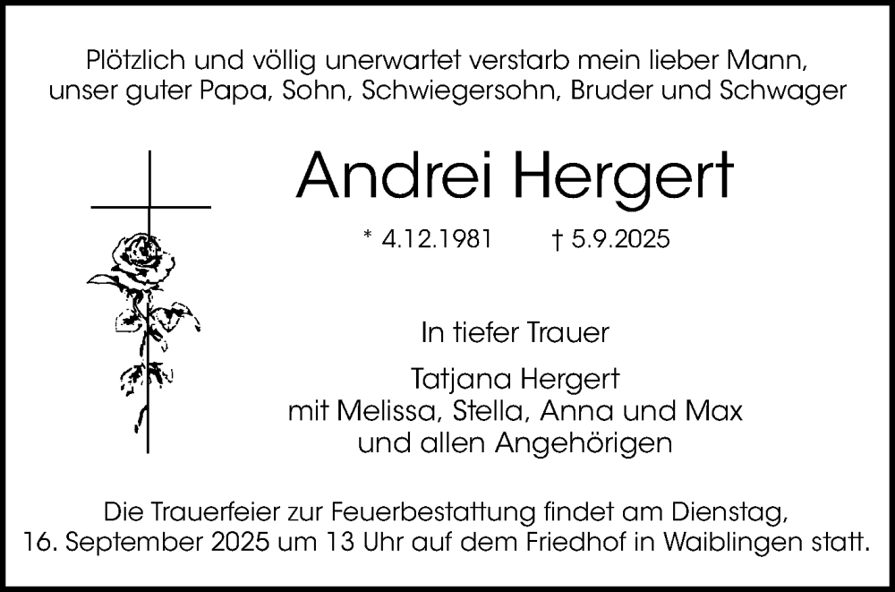Hier finden Sie alle Traueranzeigen aus der Zeitung, die bisher für Andrei Hergert erschienen sind. Weitere Traueranzeigen, die in der Zeitung erscheinen, werden hier ebenfalls aufgelistet