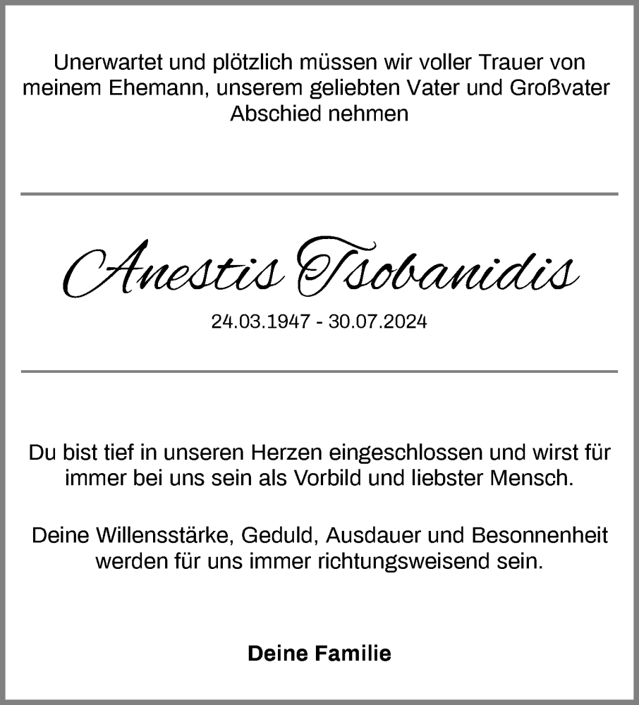 Hier finden Sie alle Traueranzeigen aus der Zeitung, die bisher für Anestis Tsobanidis erschienen sind. Weitere Traueranzeigen, die in der Zeitung erscheinen, werden hier ebenfalls aufgelistet