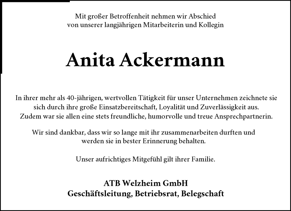 Hier finden Sie alle Traueranzeigen aus der Zeitung, die bisher für Anita Ackermann erschienen sind. Weitere Traueranzeigen, die in der Zeitung erscheinen, werden hier ebenfalls aufgelistet