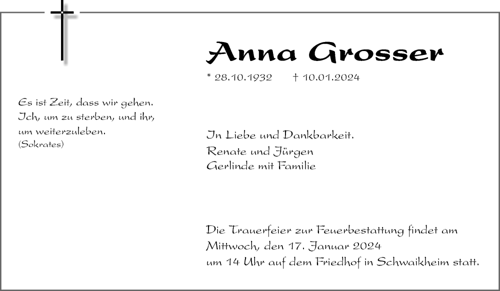 Hier finden Sie alle Traueranzeigen aus der Zeitung, die bisher für Anna Grosser erschienen sind. Weitere Traueranzeigen, die in der Zeitung erscheinen, werden hier ebenfalls aufgelistet