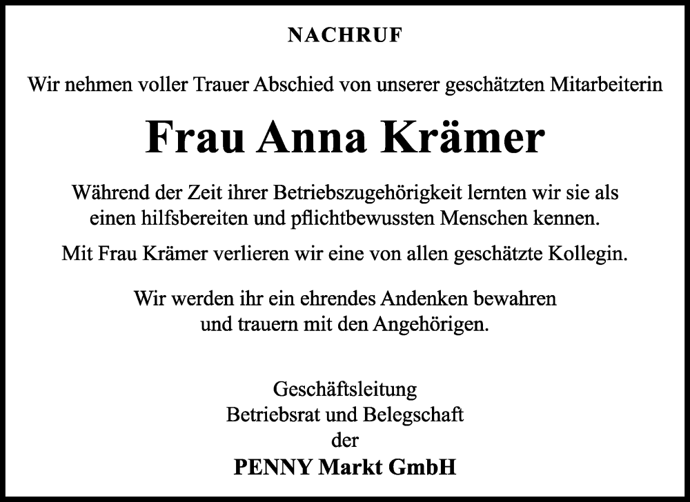 Hier finden Sie alle Traueranzeigen aus der Zeitung, die bisher für Anna Krämer erschienen sind. Weitere Traueranzeigen, die in der Zeitung erscheinen, werden hier ebenfalls aufgelistet
