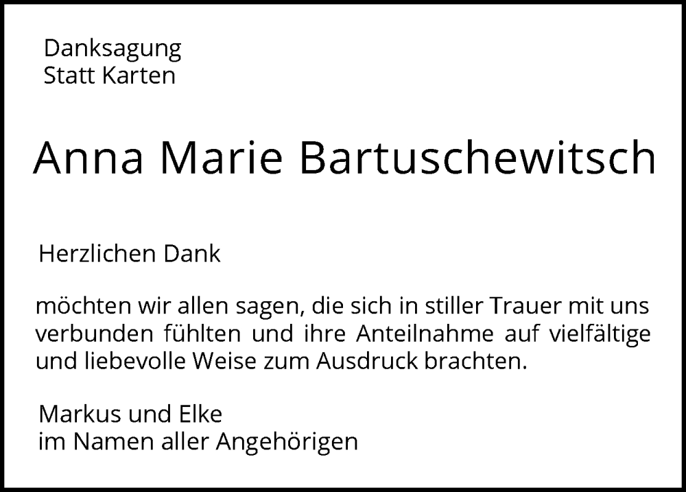 Hier finden Sie alle Traueranzeigen aus der Zeitung, die bisher für Anna Marie Bartuschewitsch erschienen sind. Weitere Traueranzeigen, die in der Zeitung erscheinen, werden hier ebenfalls aufgelistet