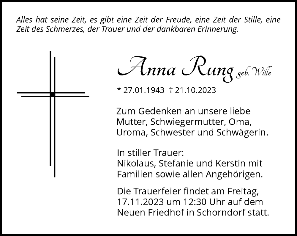 Hier finden Sie alle Traueranzeigen aus der Zeitung, die bisher für Anna Rung erschienen sind. Weitere Traueranzeigen, die in der Zeitung erscheinen, werden hier ebenfalls aufgelistet