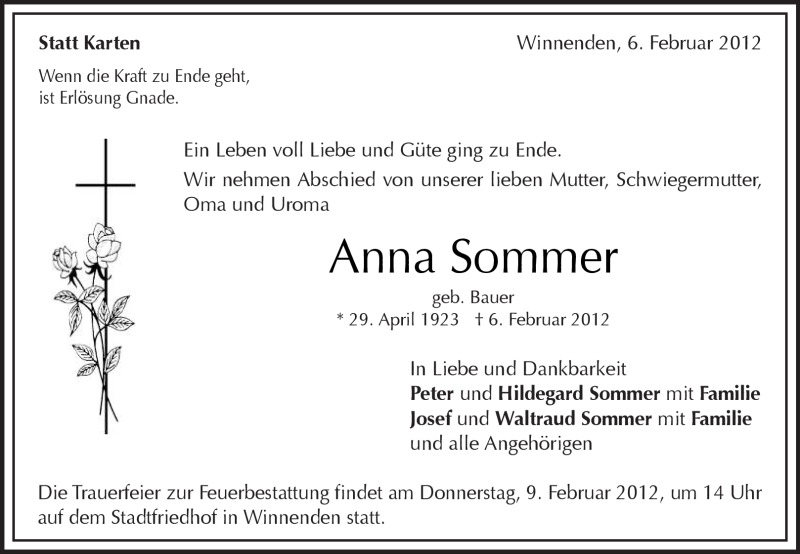 Hier finden Sie alle Traueranzeigen aus der Zeitung, die bisher für Anna Sommer erschienen sind. Weitere Traueranzeigen, die in der Zeitung erscheinen, werden hier ebenfalls aufgelistet
