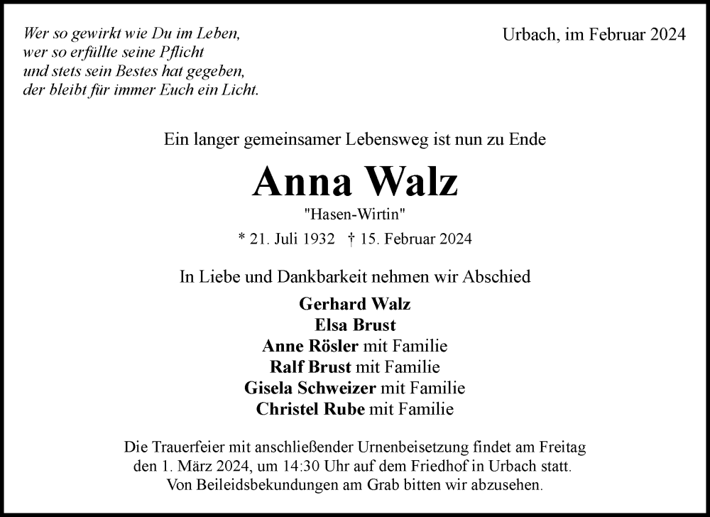 Hier finden Sie alle Traueranzeigen aus der Zeitung, die bisher für Anna Walz erschienen sind. Weitere Traueranzeigen, die in der Zeitung erscheinen, werden hier ebenfalls aufgelistet