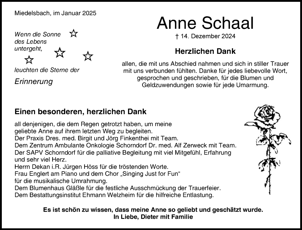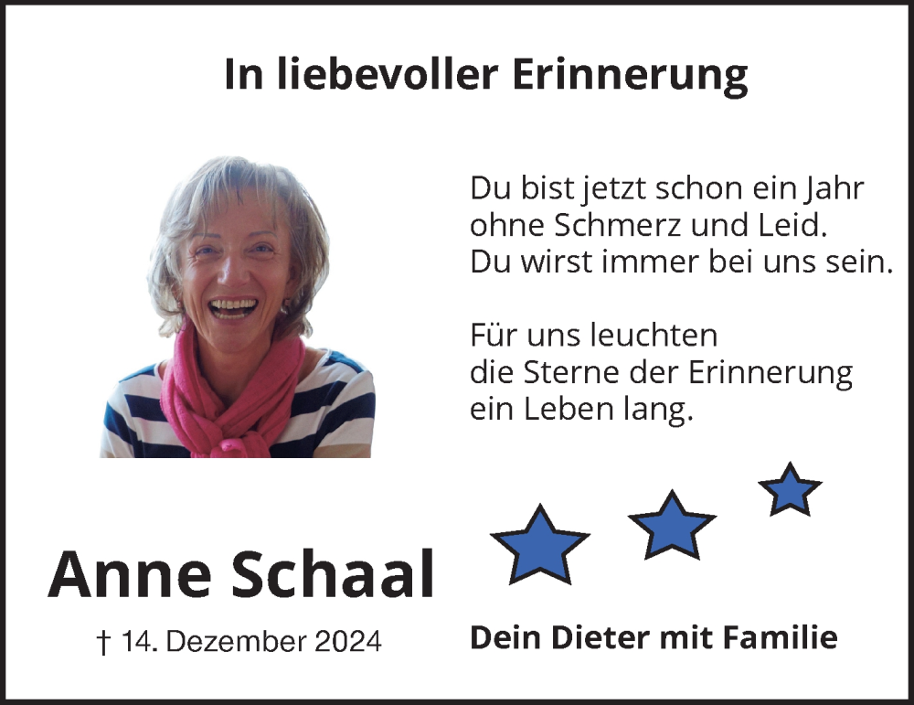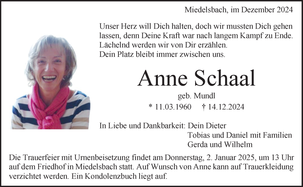 Hier finden Sie alle Traueranzeigen aus der Zeitung, die bisher für Anne Schaal erschienen sind. Weitere Traueranzeigen, die in der Zeitung erscheinen, werden hier ebenfalls aufgelistet