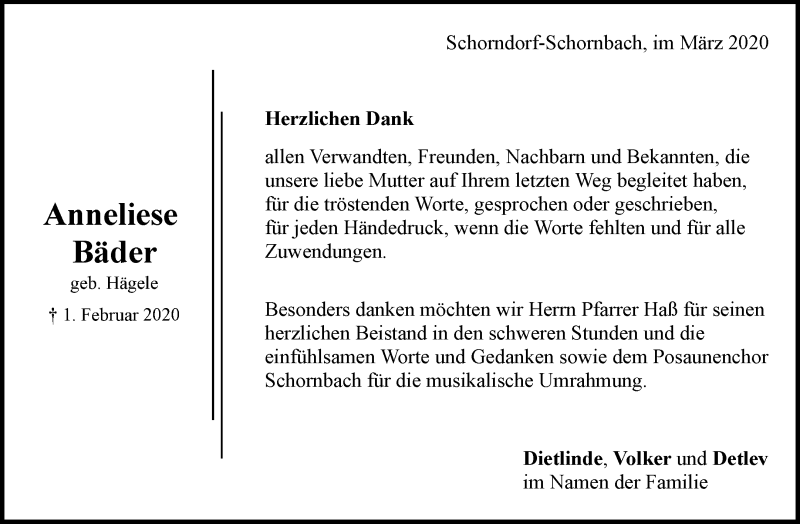 Hier finden Sie alle Traueranzeigen aus der Zeitung, die bisher für Anneliese Bäder erschienen sind. Weitere Traueranzeigen, die in der Zeitung erscheinen, werden hier ebenfalls aufgelistet