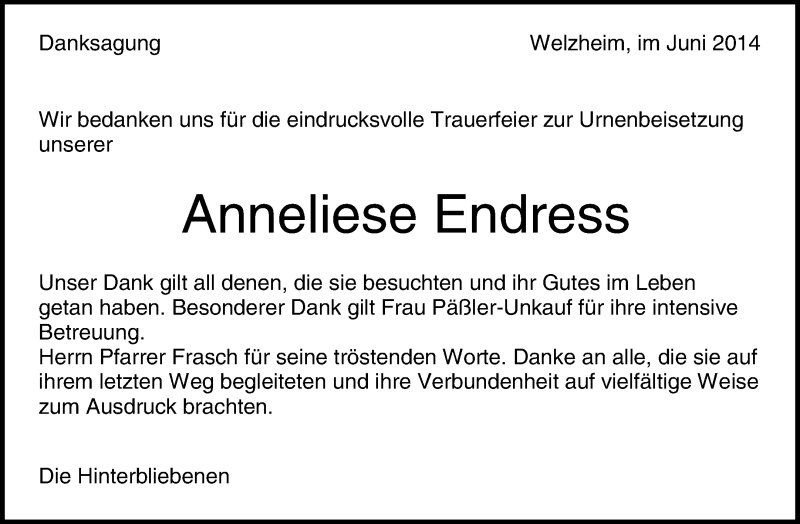 Hier finden Sie alle Traueranzeigen aus der Zeitung, die bisher für Anneliese Endress erschienen sind. Weitere Traueranzeigen, die in der Zeitung erscheinen, werden hier ebenfalls aufgelistet