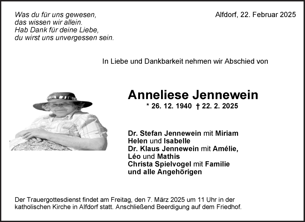 Hier finden Sie alle Traueranzeigen aus der Zeitung, die bisher für Anneliese Jennewein erschienen sind. Weitere Traueranzeigen, die in der Zeitung erscheinen, werden hier ebenfalls aufgelistet