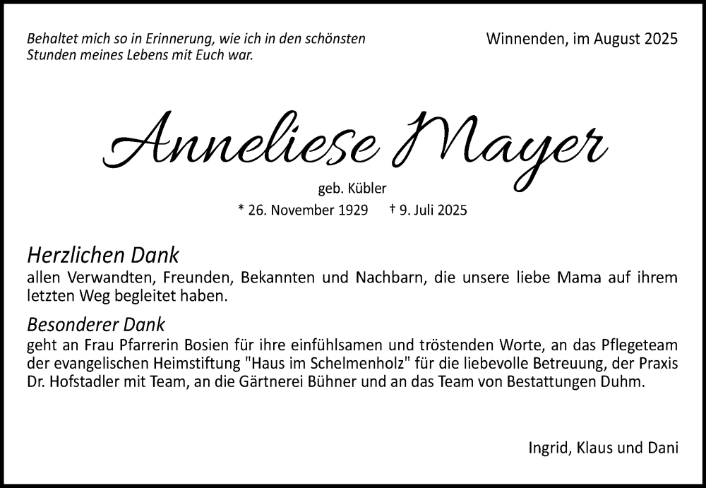 Hier finden Sie alle Traueranzeigen aus der Zeitung, die bisher für Anneliese Mayer erschienen sind. Weitere Traueranzeigen, die in der Zeitung erscheinen, werden hier ebenfalls aufgelistet