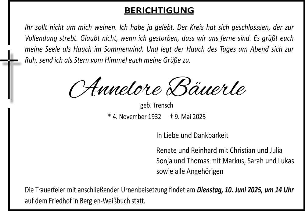 Hier finden Sie alle Traueranzeigen aus der Zeitung, die bisher für Annelore Bäuerle erschienen sind. Weitere Traueranzeigen, die in der Zeitung erscheinen, werden hier ebenfalls aufgelistet