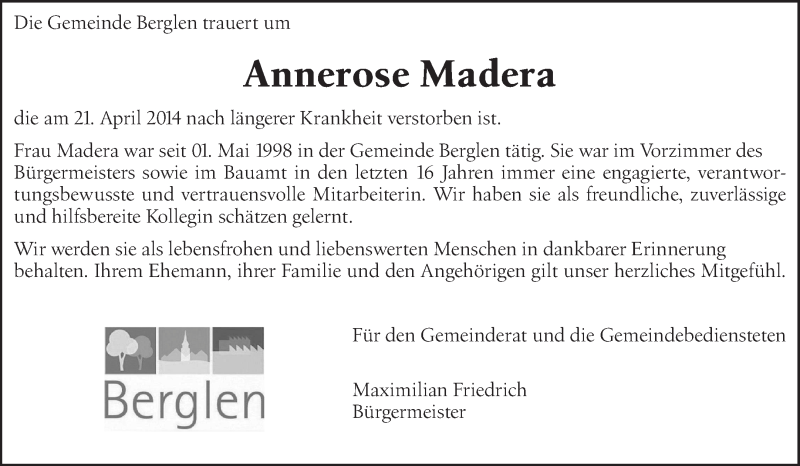 Hier finden Sie alle Traueranzeigen aus der Zeitung, die bisher für Annerose Madera erschienen sind. Weitere Traueranzeigen, die in der Zeitung erscheinen, werden hier ebenfalls aufgelistet