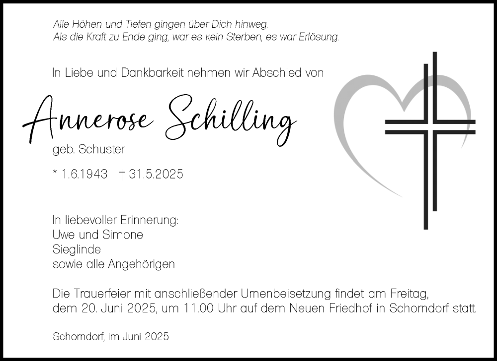 Hier finden Sie alle Traueranzeigen aus der Zeitung, die bisher für Annerose Schilling erschienen sind. Weitere Traueranzeigen, die in der Zeitung erscheinen, werden hier ebenfalls aufgelistet