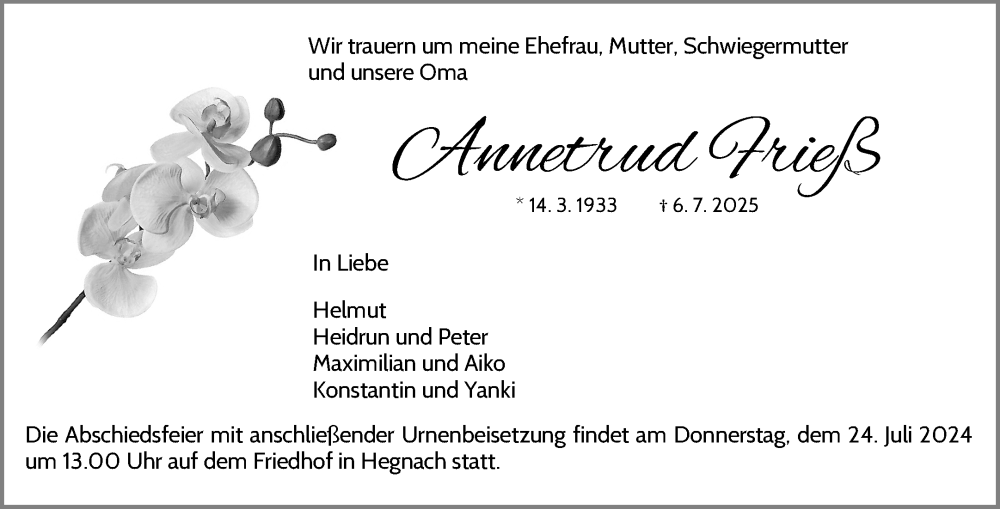 Hier finden Sie alle Traueranzeigen aus der Zeitung, die bisher für Annetrud Frieß erschienen sind. Weitere Traueranzeigen, die in der Zeitung erscheinen, werden hier ebenfalls aufgelistet