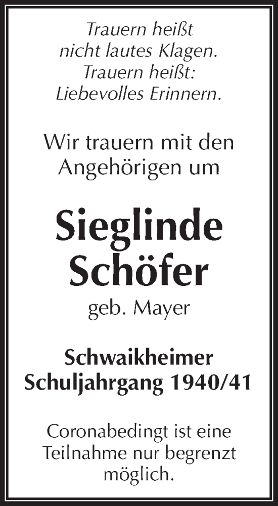 Hier finden Sie alle Traueranzeigen aus der Zeitung, die bisher für AnSieglinde Schöfer erschienen sind. Weitere Traueranzeigen, die in der Zeitung erscheinen, werden hier ebenfalls aufgelistet