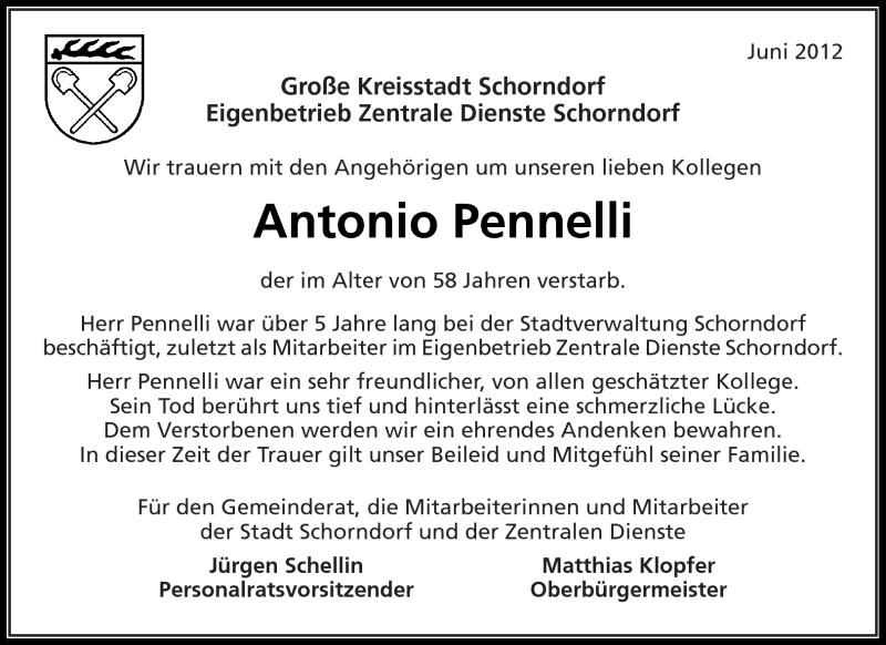 Hier finden Sie alle Traueranzeigen aus der Zeitung, die bisher für Antonio Pennelli erschienen sind. Weitere Traueranzeigen, die in der Zeitung erscheinen, werden hier ebenfalls aufgelistet