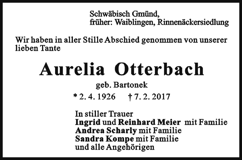 Hier finden Sie alle Traueranzeigen aus der Zeitung, die bisher für Aurelia Otterbach erschienen sind. Weitere Traueranzeigen, die in der Zeitung erscheinen, werden hier ebenfalls aufgelistet