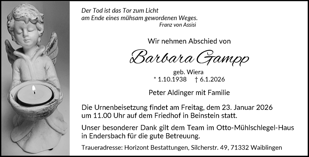Hier finden Sie alle Traueranzeigen aus der Zeitung, die bisher für Barbara Gampp erschienen sind. Weitere Traueranzeigen, die in der Zeitung erscheinen, werden hier ebenfalls aufgelistet