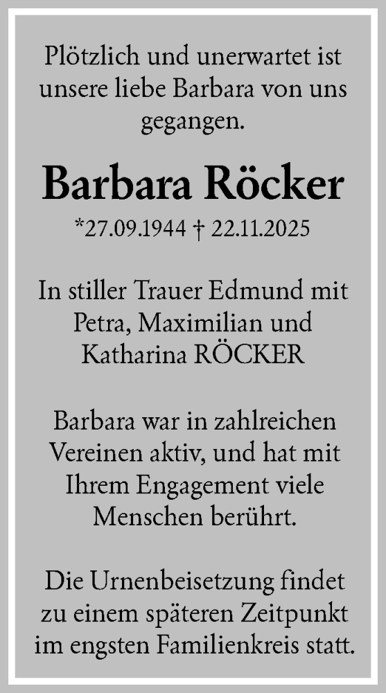Hier finden Sie alle Traueranzeigen aus der Zeitung, die bisher für Barbara Röcker erschienen sind. Weitere Traueranzeigen, die in der Zeitung erscheinen, werden hier ebenfalls aufgelistet