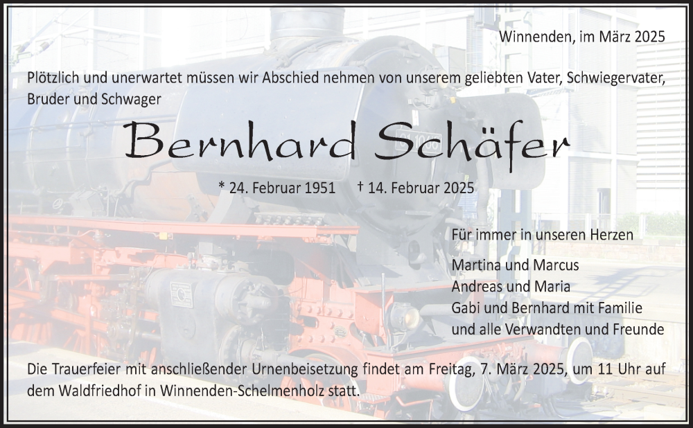 Hier finden Sie alle Traueranzeigen aus der Zeitung, die bisher für Bernhard Schäfer erschienen sind. Weitere Traueranzeigen, die in der Zeitung erscheinen, werden hier ebenfalls aufgelistet