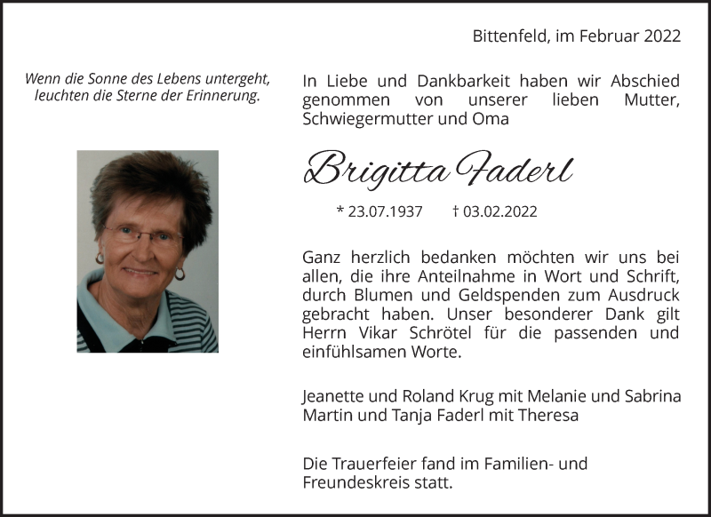 Hier finden Sie alle Traueranzeigen aus der Zeitung, die bisher für Brigitta Faderl erschienen sind. Weitere Traueranzeigen, die in der Zeitung erscheinen, werden hier ebenfalls aufgelistet