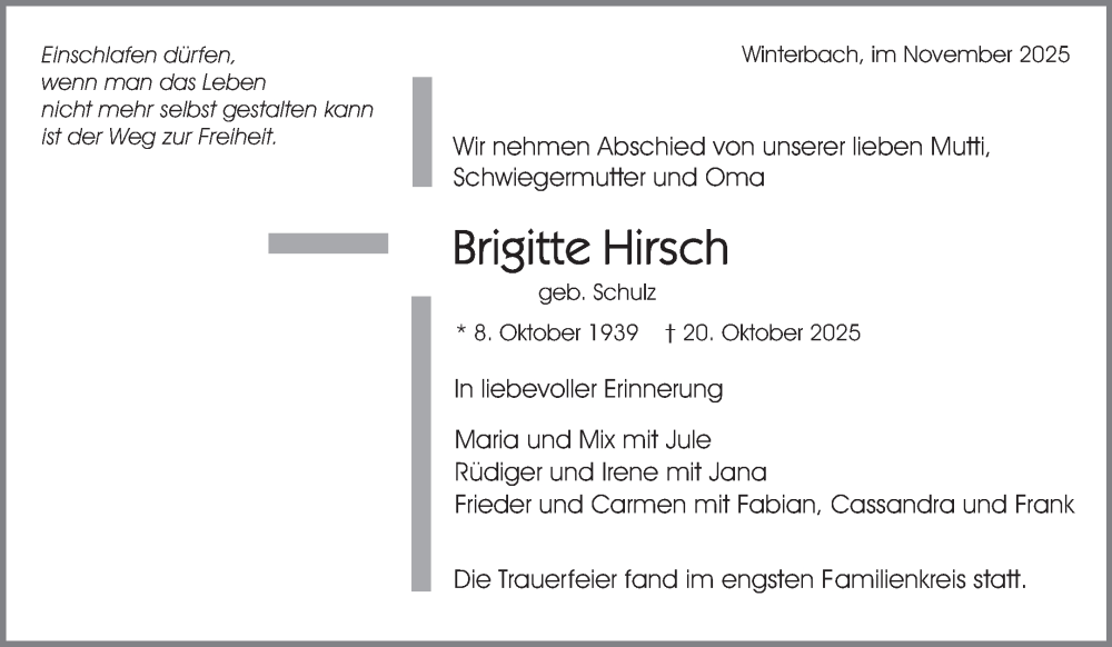 Hier finden Sie alle Traueranzeigen aus der Zeitung, die bisher für Brigitte Hirsch erschienen sind. Weitere Traueranzeigen, die in der Zeitung erscheinen, werden hier ebenfalls aufgelistet