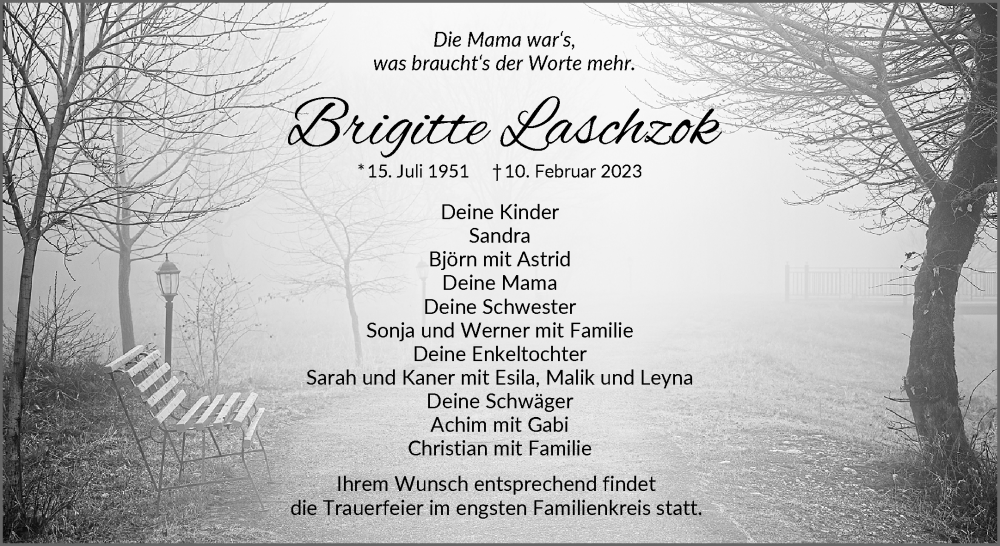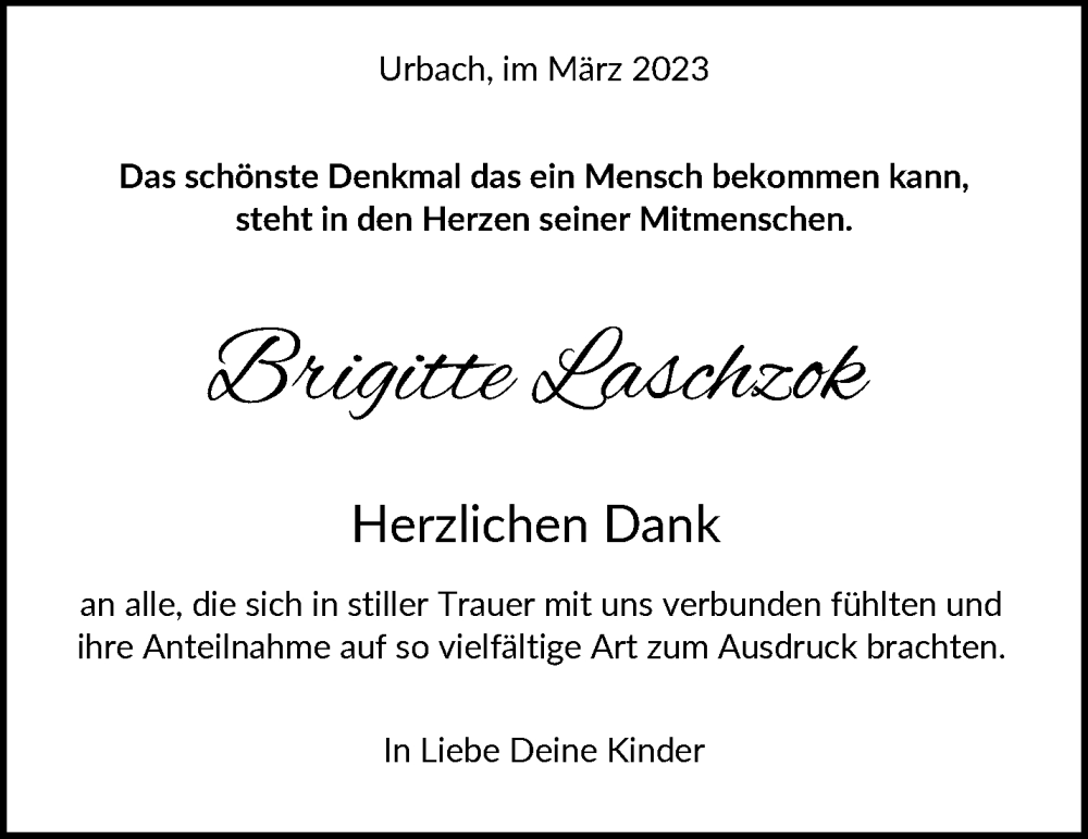 Hier finden Sie alle Traueranzeigen aus der Zeitung, die bisher für Brigitte Laschzok erschienen sind. Weitere Traueranzeigen, die in der Zeitung erscheinen, werden hier ebenfalls aufgelistet