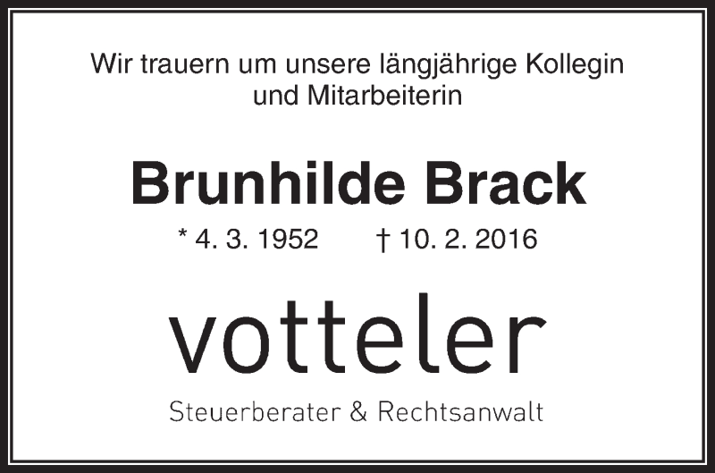 Hier finden Sie alle Traueranzeigen aus der Zeitung, die bisher für Brunhilde Brack erschienen sind. Weitere Traueranzeigen, die in der Zeitung erscheinen, werden hier ebenfalls aufgelistet