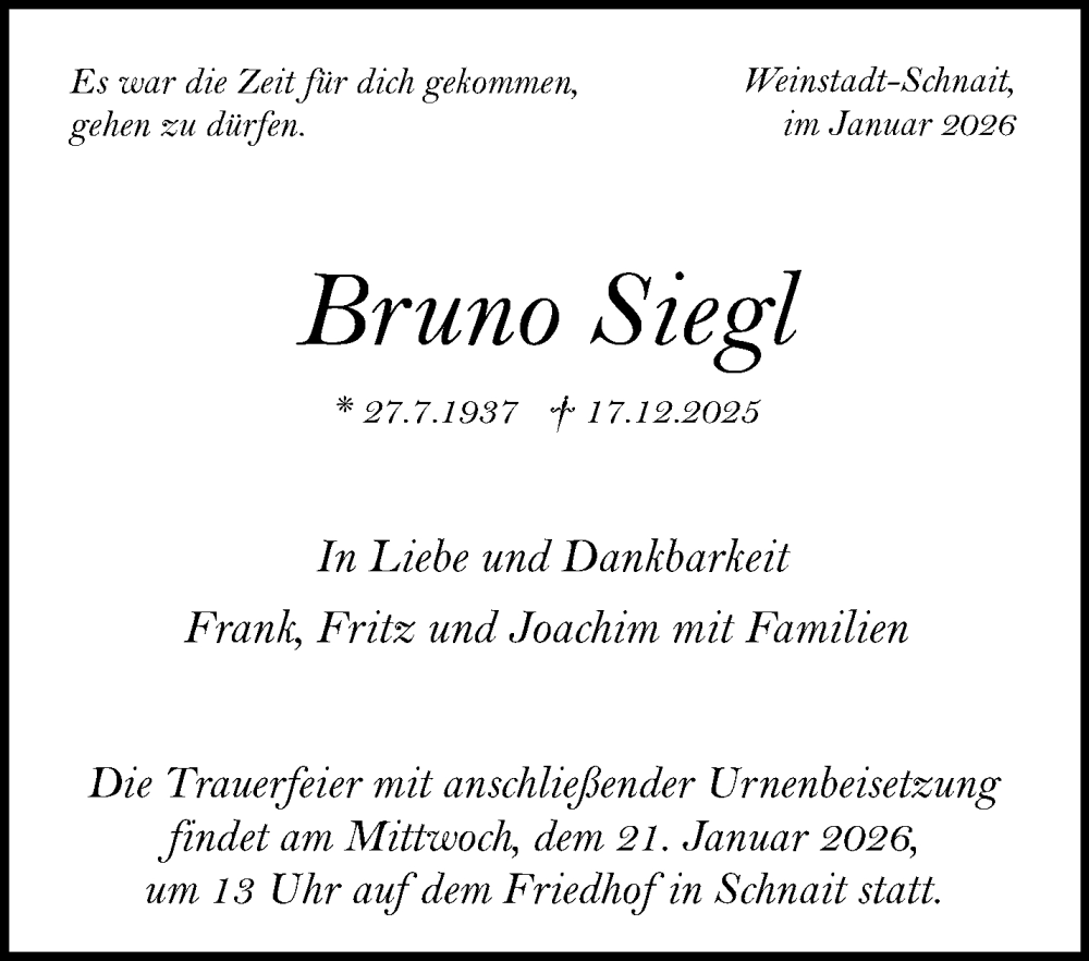 Hier finden Sie alle Traueranzeigen aus der Zeitung, die bisher für Bruno Siegl erschienen sind. Weitere Traueranzeigen, die in der Zeitung erscheinen, werden hier ebenfalls aufgelistet