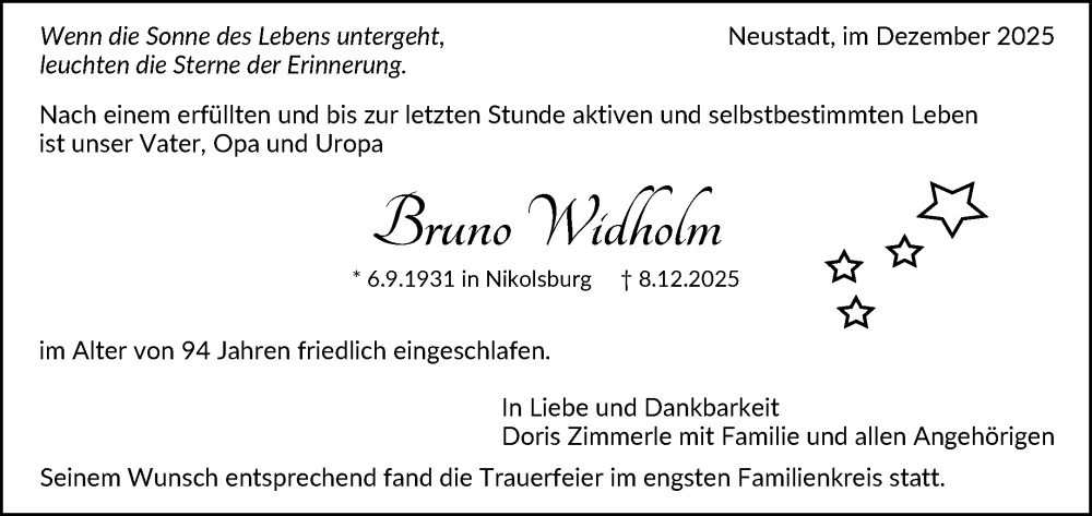 Hier finden Sie alle Traueranzeigen aus der Zeitung, die bisher für Bruno Widholm erschienen sind. Weitere Traueranzeigen, die in der Zeitung erscheinen, werden hier ebenfalls aufgelistet