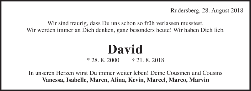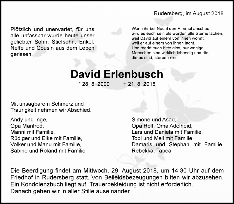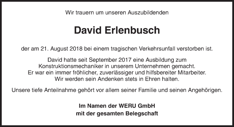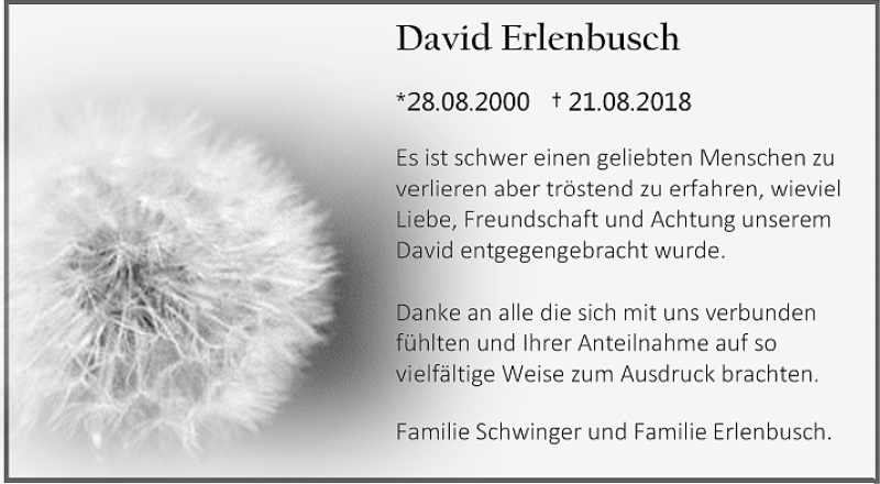 Hier finden Sie alle Traueranzeigen aus der Zeitung, die bisher für David Erlenbusch erschienen sind. Weitere Traueranzeigen, die in der Zeitung erscheinen, werden hier ebenfalls aufgelistet