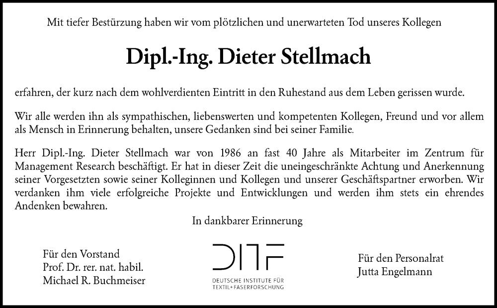 Hier finden Sie alle Traueranzeigen aus der Zeitung, die bisher für Dieter Stellmach erschienen sind. Weitere Traueranzeigen, die in der Zeitung erscheinen, werden hier ebenfalls aufgelistet