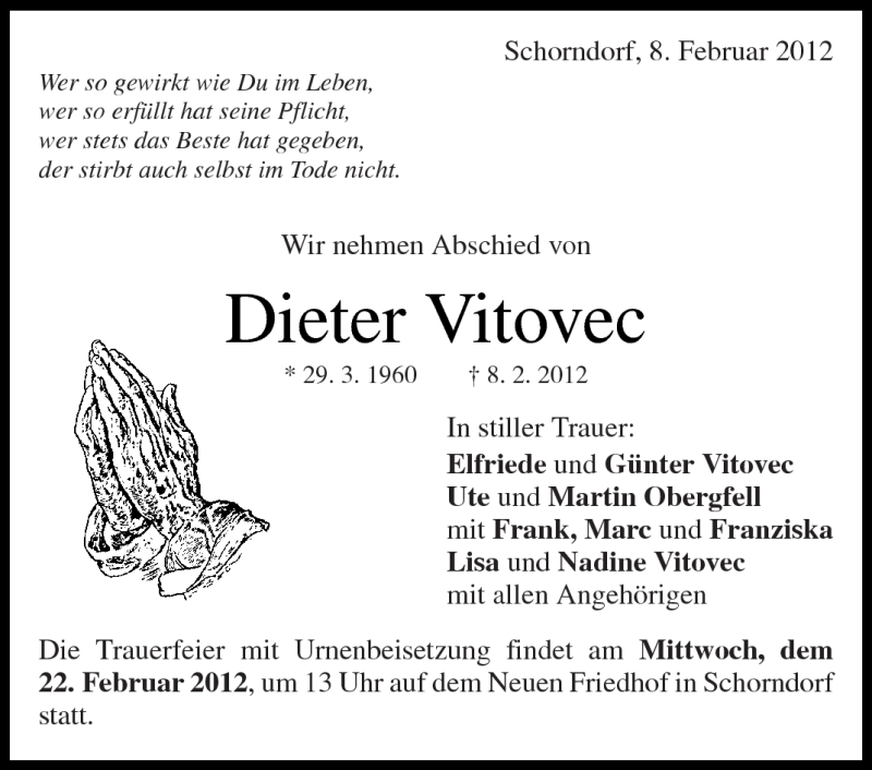 Hier finden Sie alle Traueranzeigen aus der Zeitung, die bisher für Dieter Vitovec erschienen sind. Weitere Traueranzeigen, die in der Zeitung erscheinen, werden hier ebenfalls aufgelistet