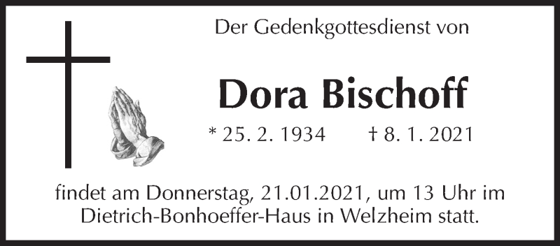 Hier finden Sie alle Traueranzeigen aus der Zeitung, die bisher für Dora Bischoff erschienen sind. Weitere Traueranzeigen, die in der Zeitung erscheinen, werden hier ebenfalls aufgelistet
