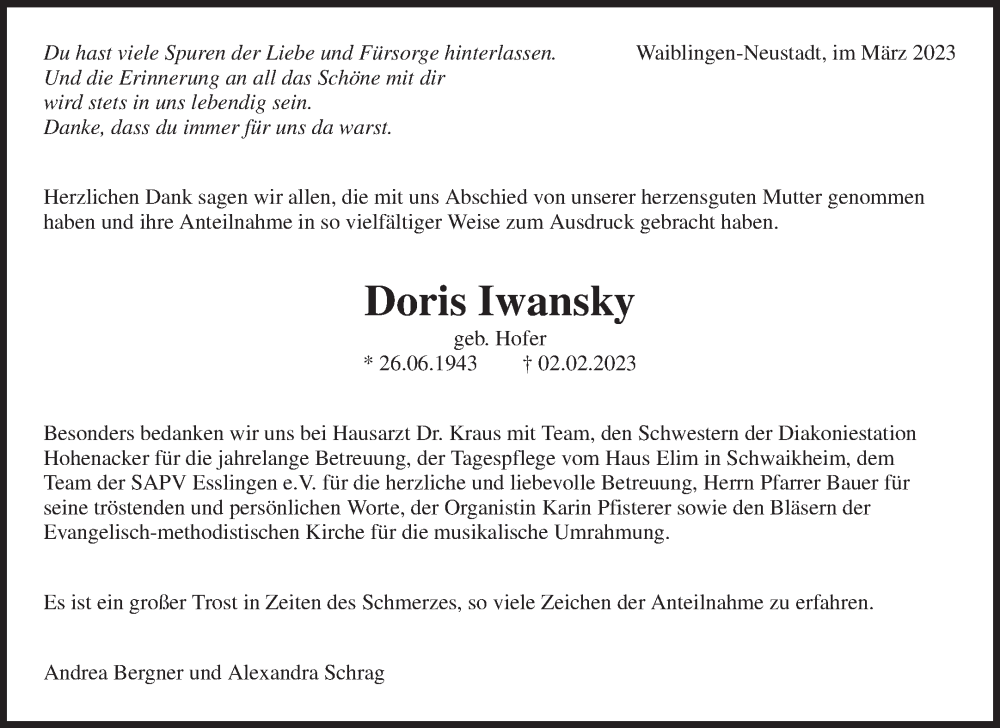 Hier finden Sie alle Traueranzeigen aus der Zeitung, die bisher für Doris Iwansky erschienen sind. Weitere Traueranzeigen, die in der Zeitung erscheinen, werden hier ebenfalls aufgelistet