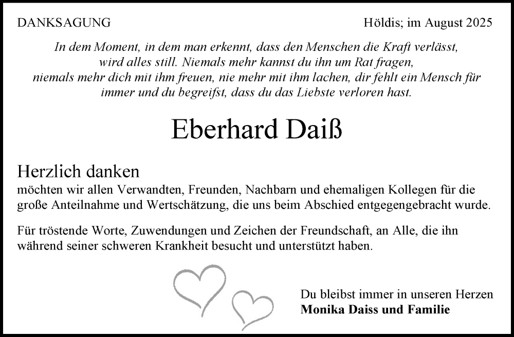 Hier finden Sie alle Traueranzeigen aus der Zeitung, die bisher für Eberhard Daiß erschienen sind. Weitere Traueranzeigen, die in der Zeitung erscheinen, werden hier ebenfalls aufgelistet