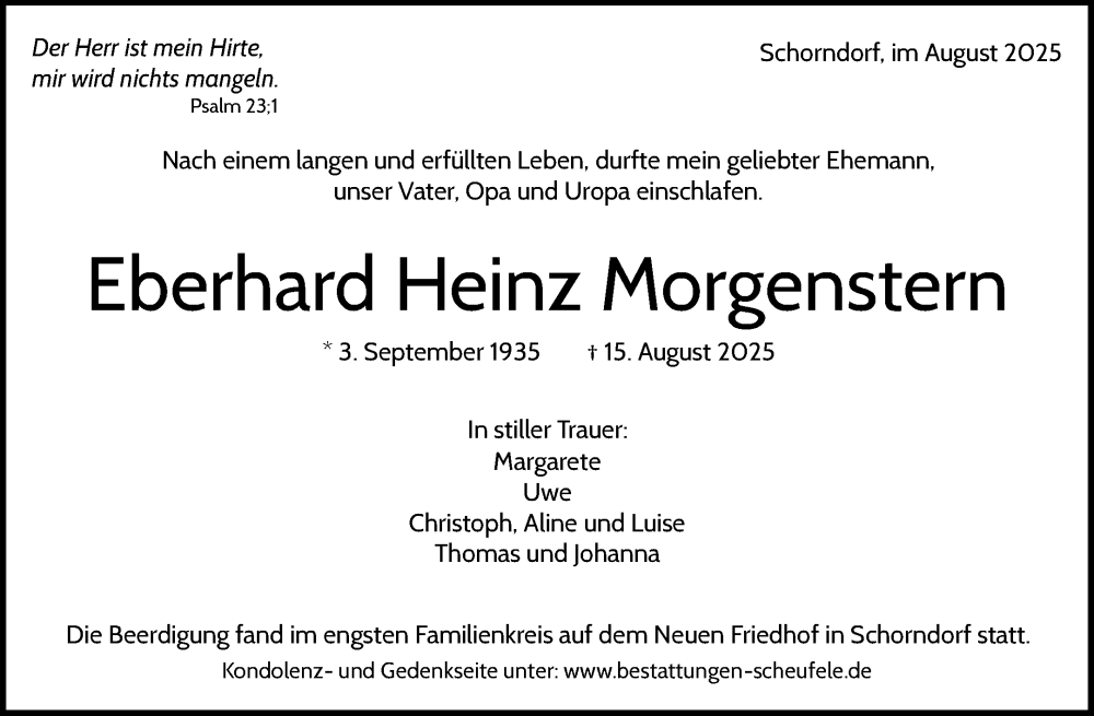 Hier finden Sie alle Traueranzeigen aus der Zeitung, die bisher für Eberhard Heinz Morgenstern erschienen sind. Weitere Traueranzeigen, die in der Zeitung erscheinen, werden hier ebenfalls aufgelistet