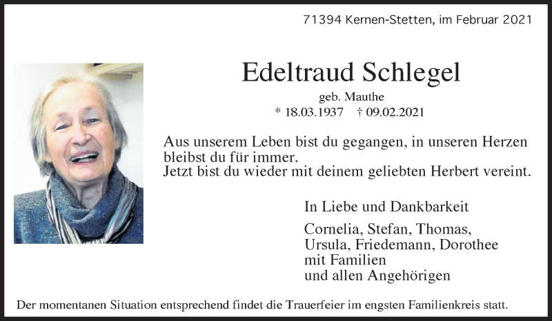 Hier finden Sie alle Traueranzeigen aus der Zeitung, die bisher für Edeltraud Schlegel erschienen sind. Weitere Traueranzeigen, die in der Zeitung erscheinen, werden hier ebenfalls aufgelistet